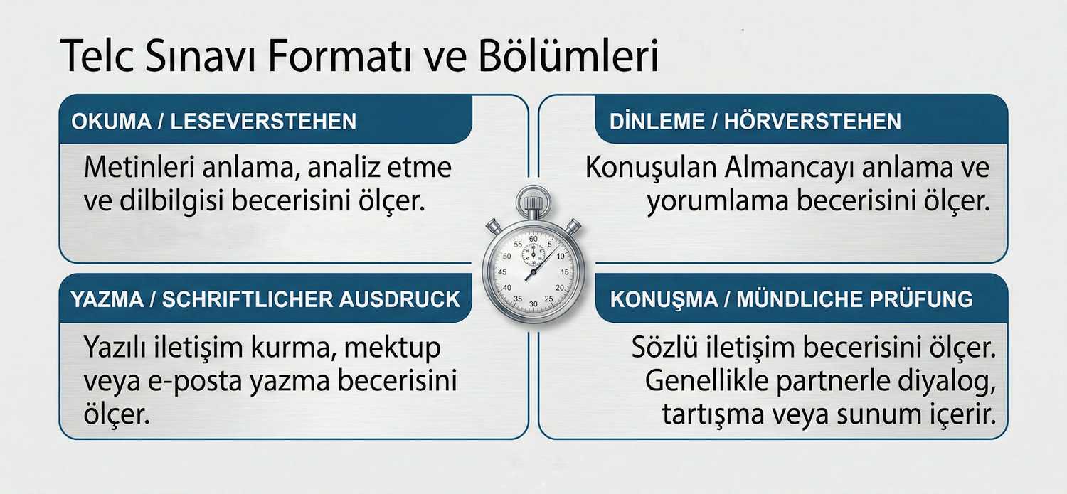 Telc sınavları genellikle iki ana bölümden oluşur: